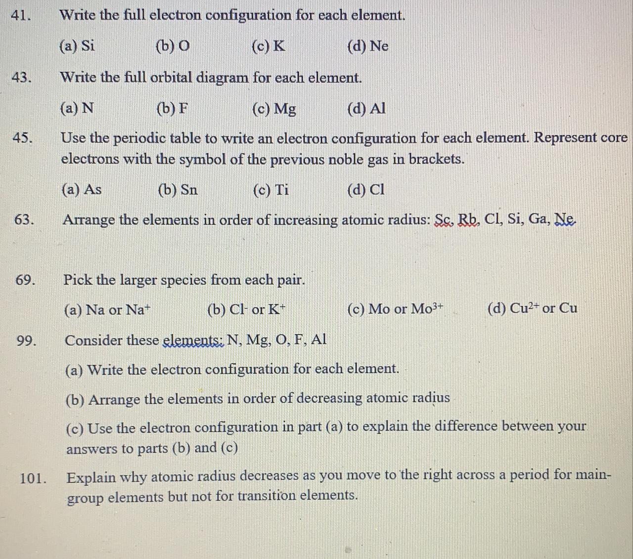 Question: 41. Write the full electron configuration for each element. (a) Si (b) 0 (c) K (d) Ne 43. Write the full orbital diagram for each element. (a) N (b)F (c) Mg (d) Al 45. Use the periodic table to write an electron configuration for each element. Represent core electrons with the symbol of the previous noble gas in brackets.