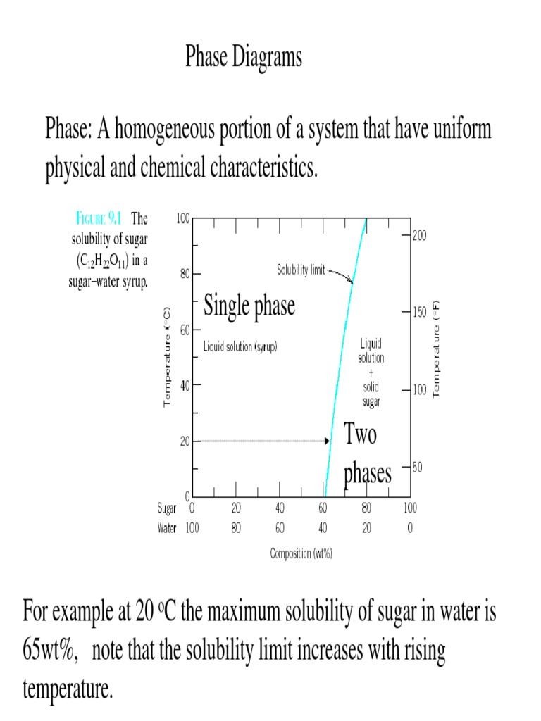 Suppose the maximum solubility of lead in tin is 5% Pb. whether or not we have a single or two-phase alloy depends on the temperature of the alloy. Which of the following is not a condition of unlimited solubility? Pmax - maximum # of phase(s). For Cigar shape diagram three parameters are available: 1. Phase presents: just locate the Temperature-Composition point and determine the. Partially solubility (eutectic diagram). Single phase Double phase Three phases. What is an equilibrium phase diagram? Experimental determination of a phase diagram Thermal a solid (α) state - Solvus: the line which represents the limit of solid solubility of a phase. components n: number of variables which can vary (temperature, pressure, volume) φ: maximum number of stable... interpretation of phase, simple binary phase diagrams, and development of equilibrium. microstructures upon cooling. 9.2 Solubility Limit Solubility limit is the maximum concentration of solute atoms that may dissolve in the solvent to. form a solid solution at a specific temperature.