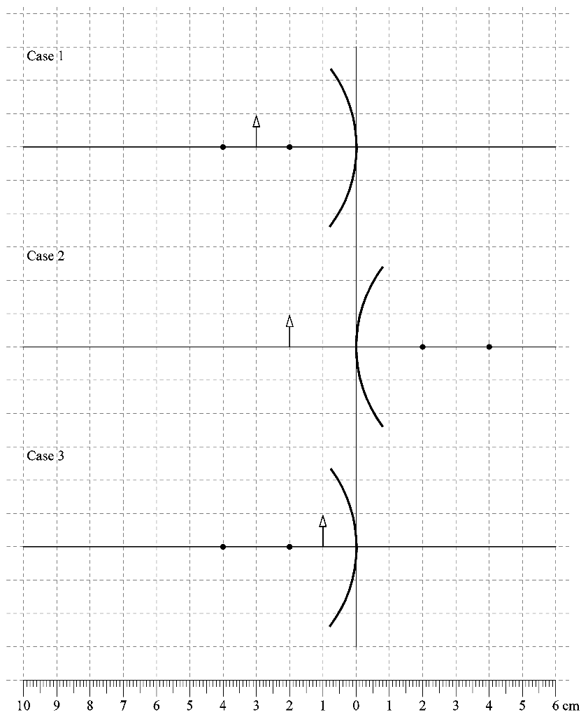 Rule 2 - Ray passing through focus will become parallel to principal axis after reflection. For a concave mirror , we see that ray passing through focus becomes parallel to principal axis after reflection. For a convex mirror, since focus is on the right side, it appears that ray passes through focus, and then it becomes parallel to principal axis. 5 The diagram shows a cuboid block made from a metal of density 2.5 g / cm 3. 2.0 cm 2.0 cm 10 cm What is the mass of the block? A 8.0 g B 16 g C 50 g D 100 g 6 The diagram shows an object moving at a constant speed in a circular path in the direction shown. A force acts on the object to keep it in the circular path. The method for drawing ray diagrams for concave mirror is described below. The method is applied to the task of drawing a ray diagram for an object located beyond the center of curvature (C) of a concave mirror. Yet the same method works for drawing a ray diagram for any object location. 1. Pick a point on the top of the object and draw two ... A ray of green light enters a liquid from air, as shown in the figure. The angle 1 is 45 o and angle 2 is 30 o. (a) Find the refractive index of liquid. (b) Show in the diagram the path of the ray after it strikes the mirror and re-enters in air.
