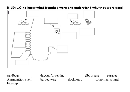 trench structures of a trench. -Describe the main features of the trench system.-Use evidence to suggest what problems soldiers might face in trenches. GREENS Label a diagram of a trench. Identify ways trenches protected soldiers. Predict what life would be like in a trench. YELLOWS Label and describe a diagram of a trench. Describe