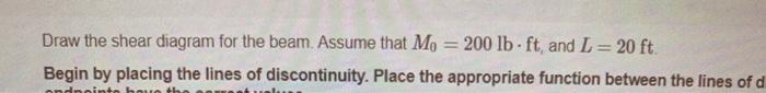 Transcribed image text: Problem 6.13 Part A Draw the shear diagram for the beam. Assume that Mo 200 lb.ft, and L 20 ft. Begin by placing the lines of discontinuity. Place the appropriate function between the lines of discontinuity, ensuring the endpoints have the correct values Note Make sure you place only one vertical line at places that require a vertical line. Academia.edu is a platform for academics to share research papers. Problem 6.13 Part A Draw the shear diagram for the beam. Assume that Mo 200 lb.ft, and L 20 ft. Begin by placing the lines of discontinuity.