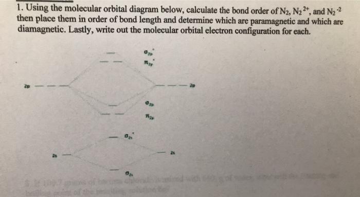 From the molecular orbital diagram of N 2, predict its bond order and whether it is diamagnetic or paramagnetic. Answer: N 2 has a bond order of 3 and is diamagnetic. Example 3. Ion Predictions with MO Diagrams Give the molecular orbital configuration for the valence electrons in C 2 2 ... Answer (1 of 2): Here is the MO diagram for O₂: Whilst this is the MO diagram for N₂: If we compare such diagrams for the diatomic molecules on the Second Period (Li₂, Be₂, B₂, C₂, N₂, O₂, and F₂), the resulting pattern looks like this: When it comes to O₂ and N₂, I think there are two things ... Two p-atomic orbitals (one from each nitrogen) atom combine to form two molecular orbitals, the bonding molecular orbital σ2px and antibonding molecular orbital σ*2px. The other four p-atomic orbitals (two from each nitrogen) atom combine to give four molecular orbitals, two bonding molecular orbitals i.e. π2py and π2pz, while two ...