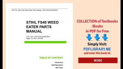 Stihl fs 45 parts diagram download. Look at the diagram and find parts that fit a Stihl FS 45 Brushcutter, or refer to the list below. All parts that fit a FS 45 Brushcutter. Select Page. A-Crankcase, Cylinder. B-Rewind starter, Muffler. C-Ignition system, Clutch. D-Air filter, Fuel tank. E-Carburetor C1Q-S44. F-Drive tube FS 45, Wrap around handle. Stihl FS 45 Service Workshop Manual Repair. Stihl FS 45 Service Workshop Manual for the Repair and service of FS45 trimmer. The PDF manual has diagrams and detailed information to troubleshoot and repair the trimmer. View free page images online or download a full digital PDF that you can easily save, print or view on all devices. Download COMPLETE Service & Repair Manual for STIHL FS 45, FS 46, FS 55 TRIMMER. It covers every single detail on your STIHL FS 45, FS 46, FS 55 TRIMMER. This manual very useful in the treatment and repair. This manual came with fully index. By having a reliable repair manual you not only save money but get to experience DIY repair your own ... FS 45, FS 46 English 3 The terminology utilized in this manual when referring to the power tool reflects the type of cutting attachments that may be mounted on it. The term "trimmer" is used to designate an FS unit that is equipped with a nylon line head or a head with flexible plastic blades (i.e., the PolyCut head.) FS models with an "R"