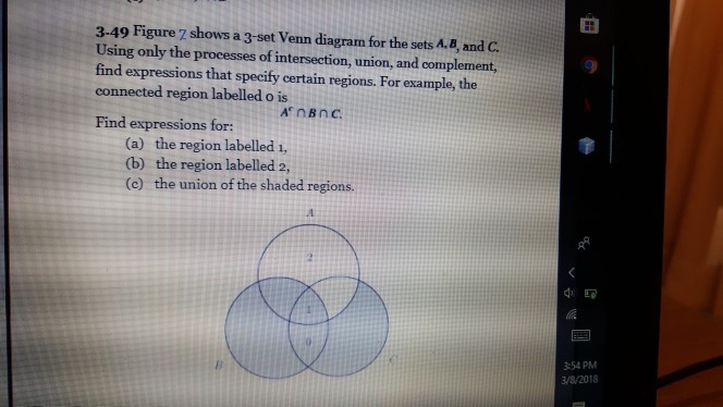 Hey all, The past few days, I've been sick and am still feeling a little icky. Makeup work is due tomorrow, and though I kind of knew how to do this pre-illness, it has escaped me without teacher help. Essentially, I just need reminders about the symbols and all that kind of stuff. Such as... - Unions - Intersections - Complements - How to tell what regions represent so-and-so in a three-set Venn Diagram Thanks! The problem: Show that P(AUB) >= 1-P(A')-P(B') for any two events A and B defined in the sample space S. (*Hint*: Use Venn diagrams.) Complements are denoted by ', unions by U, and intersections by n. So I took the hint's advice, and drew and compared the Venn diagrams of AUB and (1-P(A')-P(B')), but I'm not sure what I was looking for, I ended up drawing the two events overlapping, with them both colored in on AUB, and the space around the events filled in on (1-P(A')-P(B')). So I went ah... This one is not that hard but I just can't see it. The task is to prove the identities [shown in this image](https://imgur.com/bTPLb2A) using: the associative, commutative and distributive properties of union and intersection; the De Morgan laws and the property of the difference of two sets: A-B=AnB' (the latter being the complement of B). I don't know if I can use Venn diagrams as a proof (my guess is I can't) or if I'm allowed to use any other properties. Can anyone help? Thanks! A Venn diagram is a diagrammatic representation of ALL the possible relationships between different sets of a finite number of elements. Just like the mathematical operations on sets like Union, Difference, Intersection, Complement, etc. we have operations on Venn diagrams that are given as...