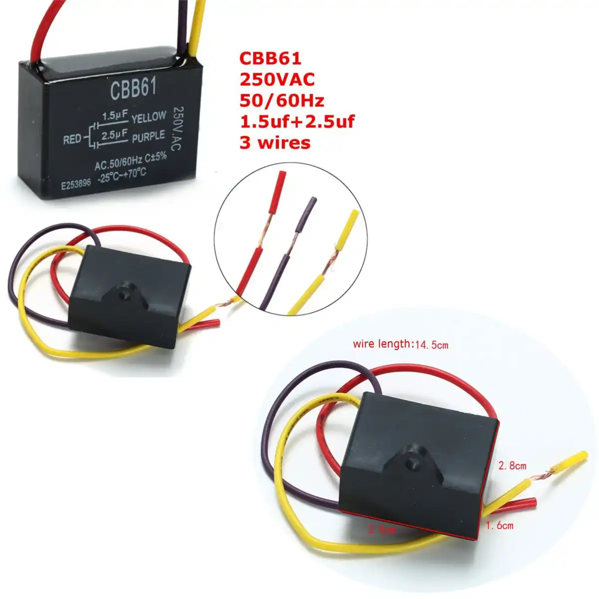 In the above diagram i shown an image of fan motor capacitor which CBB61 and it's a 5 wire capacitor, the two gray wire are common and red is uF V and Brown is 6 uF Volts and Purple is 5 micro farad and V. CBB61 uf/6uf/6uf 5 wire capacitor Deals of the Day · Read Ratings & Reviews · Fast Shipping · Shop Our Huge Selection2,,+ followers on ...
