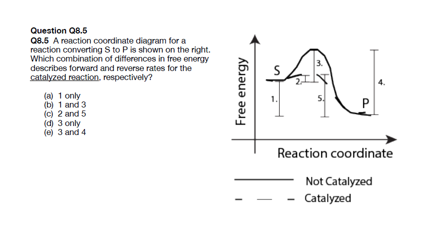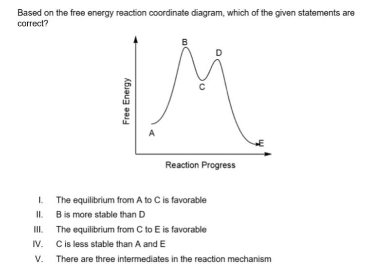 (B) The reaction coordinate diagram for this reaction plots the changes in Gibbs free energy (ΔG) during the conversion of reactants (R) → TS → products (P). P has lower free energy than R, so this reaction is thermodynamically favorable, that is, it proceeds with the release of free energy: ΔG = −k BT ln K eq is negative, so the equilibrium