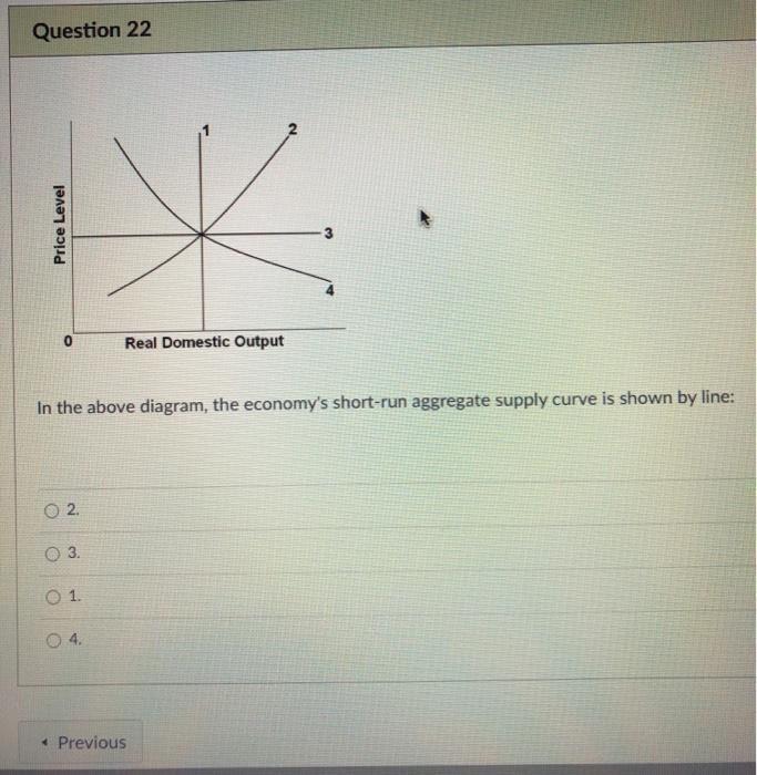 Answer Option 4 The short-run AS curve is upward slopi …. View the full answer. Transcribed image text: In the diagram, the economy's short-run AS curve is line , and its long-run AS curve is line is 3:4. Previous question Next question.