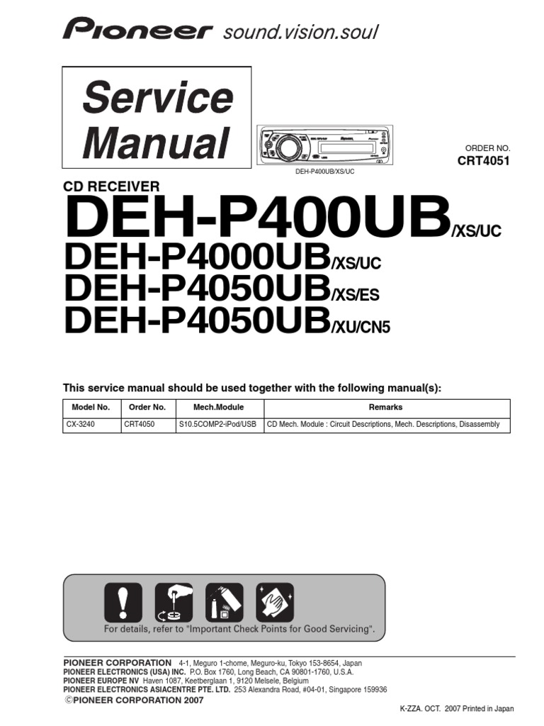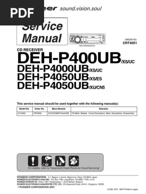 Service Manual for PIONEER DEH-P4000UB/XS/UC, downloadable as a PDF file.. We also have owner's manual to this model.. Manual details. Immediate download after payment.; Delivered as a PDF file. The manual has 71 pages; File size: 8.07 MB; Available language versions: English Different language versions may vary sligthly in file size and page count.