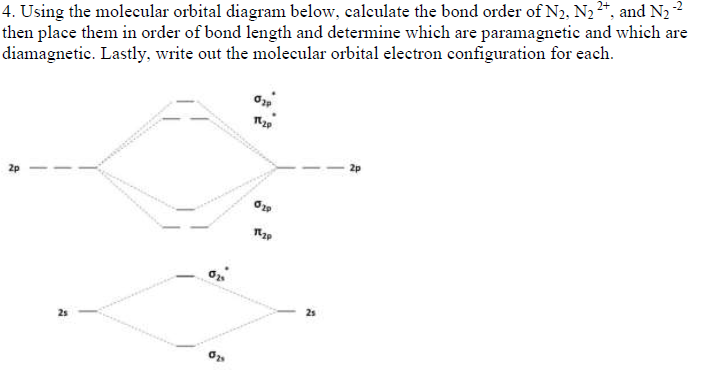 Using the MO diagram of calculate the bond order. Compare it to Answer: The MO diagram for is as follows (Miessler et al., Answer Key): (The original was this; I added the orbital depictions and symmetry labels. For further discussion on the orbital energy ordering being -like, see here and comments.) Quick overview of what […] What you need to understand are the periodic trends and how to affect bond lengths. When calculating bond orders, you use the equation Bond order= [ (# of bonding electrons)- (# of antibonding electrons)]/2. The way you find the number of bonding and antibonding electrons is by understanding and using the appropriate molecular orbital diagram. Use the MO diagram (below) to calculate the bond order for BO: Satyam G. Jai Hind College. Answer. Use the MO diagram (below) to calculate the bond order for BO: Discussion. You must be signed in to discuss. Video Transcript. we are having a model we are having We are having a baron. Sorry for this Baron Baron 1- 2 to be one. From complete energy - level diagram, we can calculate bond order, defined as one - half net number of bonding electrons. In bond orders, electrons in antibonding molecular orbitals cancel electrons in bonding molecular orbitals, while electrons in nonbonding orbitals have NO effect and are not count.