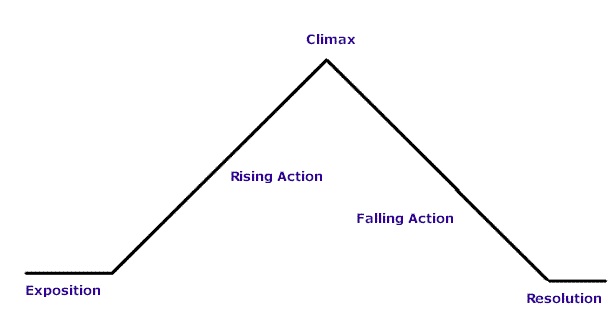 Plot is often designed with a narrative structure, storyline or story arc that includes exposition, conflict, rising action and climax, followed by a falling action and resolution. Exposition: orients the reader to the setting of the story (time and place) and introduces the characters.