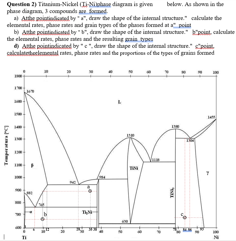 In phase diagram It consists of 3 compounds as shown. a) Draw the shape of the inner structure at the point indicated by "a". The phases formed at the point "a" Calculate element ratios, phase ratios and ratio of the formed grain types. b) Draw the shape of the inner structure at the point; Question: Question: Titanium-Nickel (Ti-Ni) phase ...