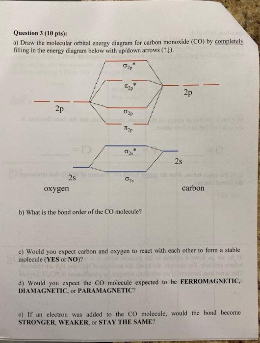 Solved 3) Sketch the molecular orbital diagram for CO ... 3) Sketch the molecular orbital diagram for CO. Calculate the bond order. Identify the highest occupied molecular orbital (HOMO) and the lowest unoccupied molecular orbital (LUMO). Does the structure predicted by molecular orbital theory match the Lewis Dot Structure? Question: 3) Sketch the molecular orbital diagram for CO. Calculate the bond ...
