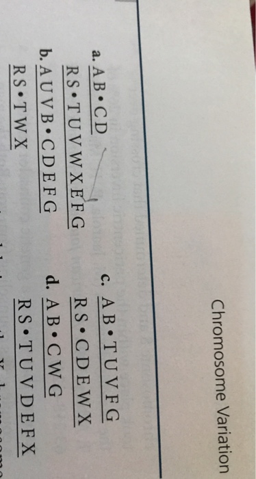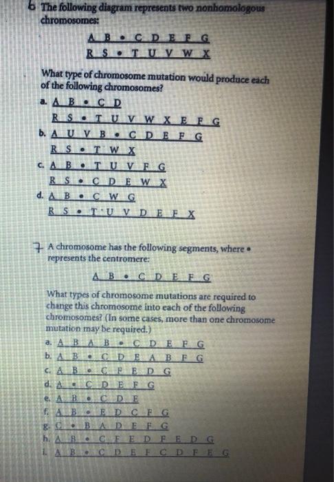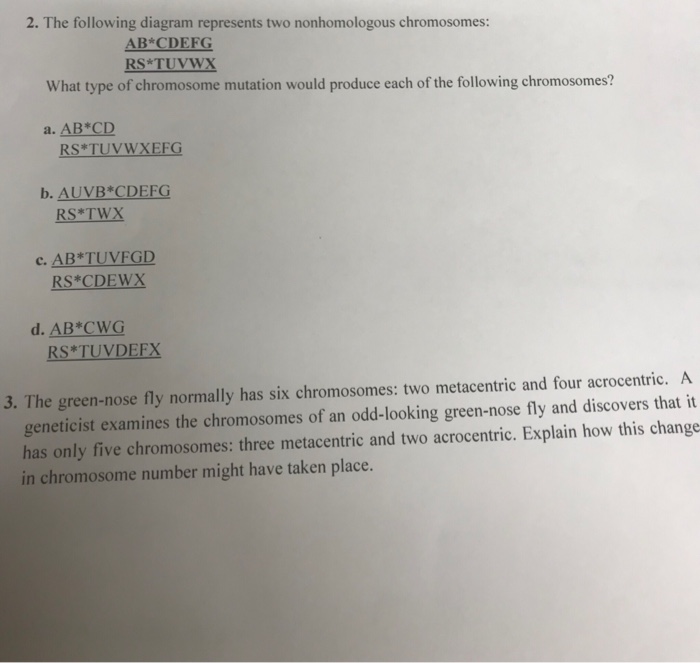 The two chromatids of a metaphase chromosome represent The two chromatids of a metaphase chromosome represent. >>. Class 11. >> Biology. >> Cell Cycle and Cell Division. >> Mitosis. >> The two chromatids of a metaphase chromo. Question. Solved The following diagram represents two | Chegg.com The following diagram represents two nonhomologous chromosomes: A B ? C D E F G. R S ? Which of the following best describes why the maximum ... Which of the following best describes why the maximum recombination frequency is 50% in the case of linked genes? a. Crossing over can only occur on two of the four chromatids during meiosis b. Crossing over can only occur on 50% of genes at any given time c. The frequency of double crossovers makes a greater-than-50% recombination frequency ... Answered: The following diagram represents two… | bartleby The following diagram represents two nonhomologous chromosomes: A B • C D E F G R S • T U V W X What type of chromosome mutation would produce each of the