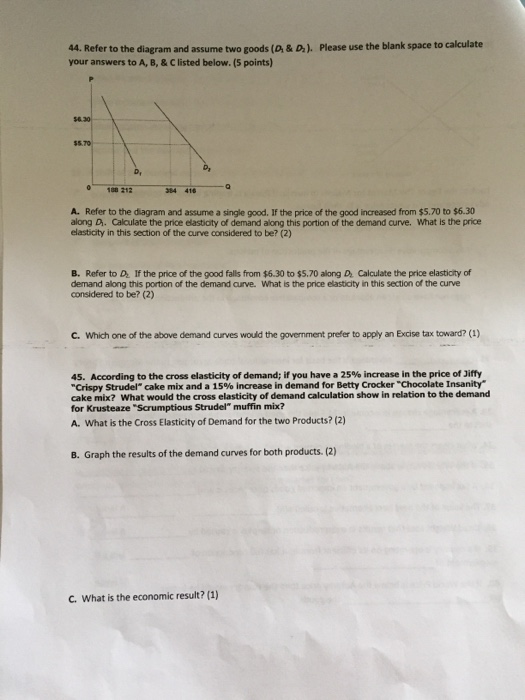 ECON 201 Final Exam Flashcards - Cram.com increase in the price of beef will cause the quantity of beef demanded to: decrease by approximately 12 percent. If a demand for a product is elastic, the value of the price elasticity coefficient is: greater than one. Refer to the above diagram. Between prices of $5.70 and $6.30: D1 is more elastic than D2. DOC MICROECONOMICS - TEST ONE - CourseNotes Use the following diagram to answer question 4: 4. Refer to the above diagram, and remember the formula for price elasticity of demand to answer this. Between prices of $5.70 and $6.30: A) D1 is more elastic than D2. B) D2 is more elastic than D1. C) D1 and D2 have identical elasticities. D) None of the above. 5. Refer to the diagram. Between prices of $5.70 and $6.30 ... Refer to the diagram. Between prices of $5.70 and $6.30: asked Aug 12, 2018 in Economics by aaden. A. D 1 is more elastic than D 2 . B. D 2 is an inferior good and D 1 is a normal good. C. D 1 and D 2 have identical elasticities. ... 30 items by LittleBig. Send feedback; DMCA. Honor Code.