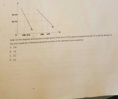 Solved $8.30 $5.70 D D 0 188 212 384 416 a Refer to the ... Transcribed image text: $8.30 $5.70 D D 0 188 212 384 416 a Refer to the diagram. Between prices of $5.70 and $6.30. Multiple Choice Dy is more elastic than Dz. Dz is an inferfor good and D, is a normal good Dz 15 more elastic than D. O, and Dz have loentical elasticities,