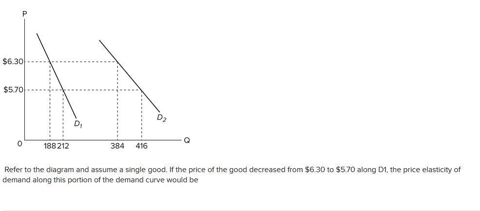 Refer to the above diagram Between prices of 570 and 630 A ... 6. Refer to the above diagram. Between prices of $5.70 and $6.30: A. D 1 is more elastic than D 2 B. D 2 is an inferior good and D 1 is a normal good. C. D 1 and D 2 have identical elasticities. D. D 2 is more elastic than D 1.. Answered: If the income elasticity of demand for… | bartleby Refer to the diagram and assume a single good. ir the price of the good increesed from $5.70 to $6.30 along D. the prnice elasticity of demand elong this portion of the demand curve would Muple Choce 12 20 10 OR