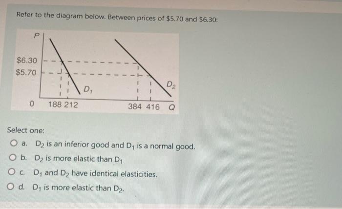 Refer to the diagram. Between prices of $5.70 and $6.30 ... Between prices of $5.70 and $6.30: - FOORQUIZ. Refer to the diagram. Between prices of $5.70 and $6.30: 1- D1 and D2 have identical elasticity's. 2- D1 is more elastic than D2. 3- D2 is more elastic than D1. 4- D2 is an inferior good and D1 is a normal good. ANSWER: 2- D1 is more elastic than D2.