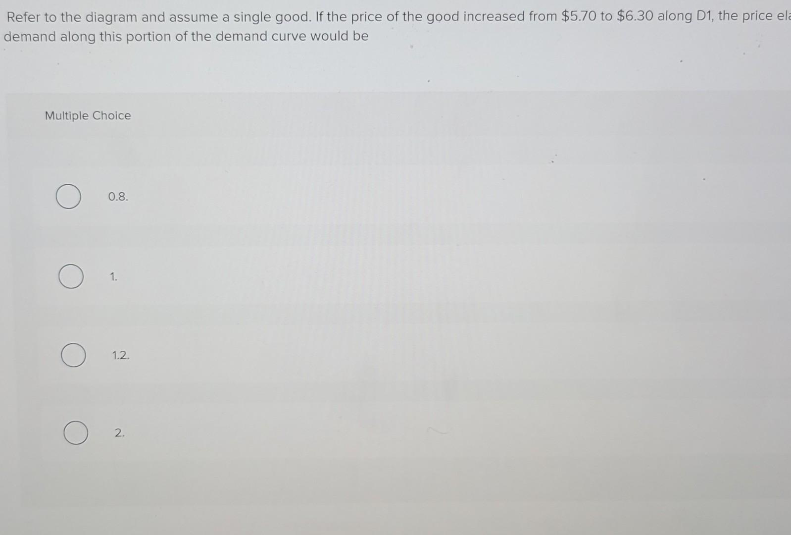 revelas Refer to the above diagram and assume a single good. If the price of the good increased from $5.70 to $6.30 along D1, the price elasticity of demand along this portion of the demand curve would be: