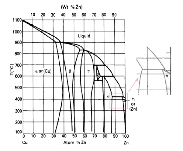 Zinc phase diagrams - Big Chemical Encyclopedia Figure 9.21 A region of the copper-zinc phase diagram that has been enlarged to show eutectoid and peritectic invariant points, labeled E (560°C, 74 wt% Zn) and P (598°C, 78.6 wt% Zn), respectively. The most common copper alloys are the brasses, for whieh zine, as a snbstitntional impurity, is the predominant alloying element.