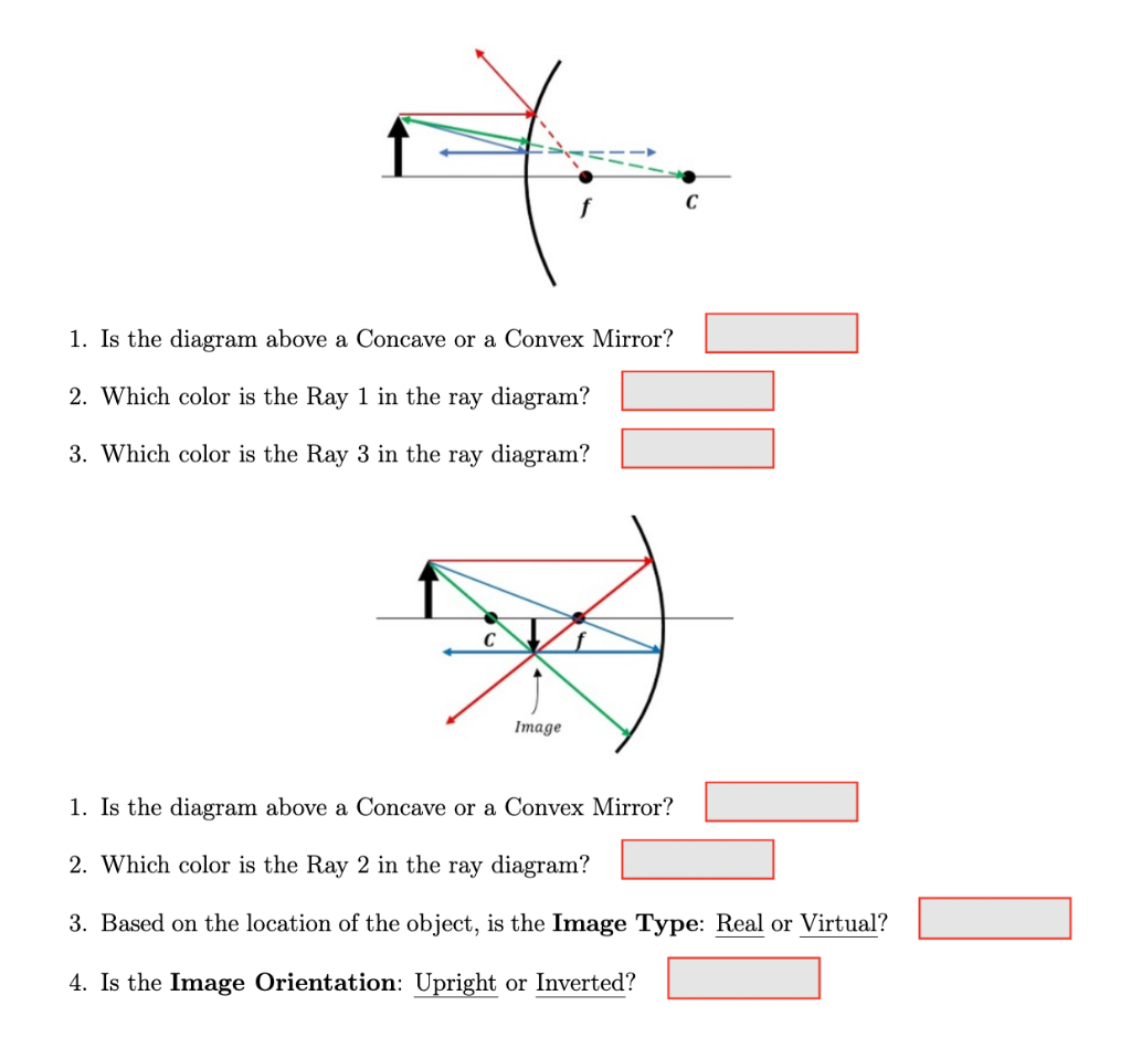 Image Formation by Spherical Mirrors: Videos, Ray Diagrams ... Let's find out the mechanism involved in the image formation by spherical mirrors… Suggested Videos Ray Diagrams Ray diagrams are used to depict the image formation by tracing the path of light rays i.e. incident rays and reflected rays. They are drawn in order for anyone to view a point on the image of an object. Concave Mirrors And Convex Mirrors - Image Formation, Ray ... Ray diagrams help us trace the path of the light for the person to view a point on the image of an object. Ray diagram uses lines with arrows to represent the incident ray and the reflected ray. It also helps us trace the direction in which the light travels. Plane Mirror vs Spherical Mirrors PDF Spherical mirror Ray diagram worksheet Spherical mirror Ray diagram worksheet: For each of the questions below, you must draw a ray diagram to show the image. 1. The concave mirror shown below has an object placed 20cm in front of it. An image is formed in 35 cm in front of the mirror. What is the nature of the image? Calculate the magnification of the image and the focal optics - Spherical mirror ray diagram question - Physics ... Spherical mirror ray diagram question. Ask Question Asked 7 years, 4 months ago. Active 9 months ago. Viewed 1k times 2 $\begingroup$ why does a ray, parallel to the principle axis, intersect the principal axis at half the radius of curvature, i.e. focus? EDIT. I was taught that in a spherical concave mirror, the rays parallel to the principle ...